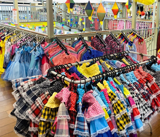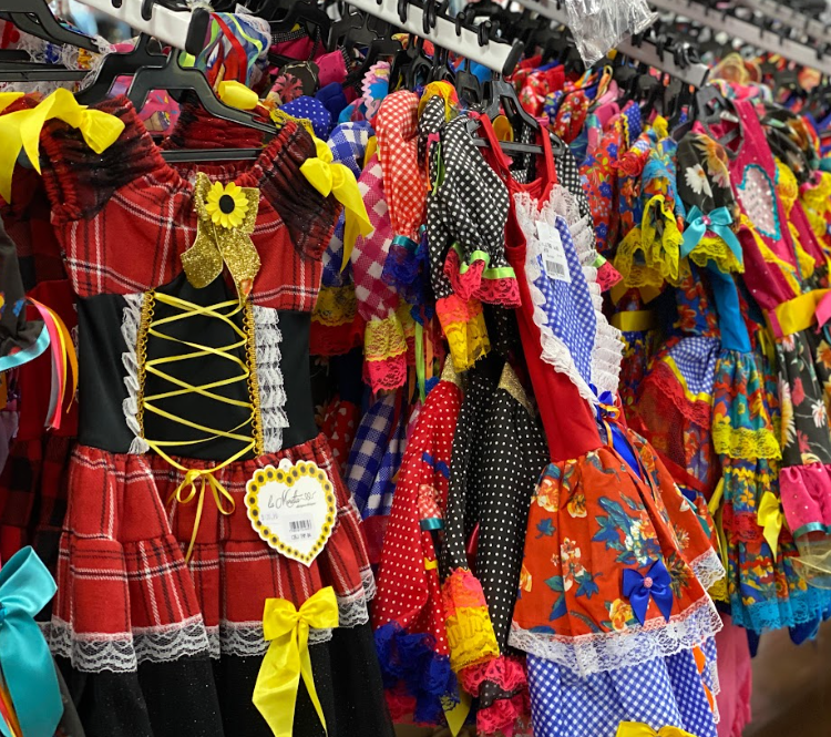 “Estamos com uma gama de variedades maior. Tipos diferentes de vestidos, saias e até croppeds”. E os meninos não ficam de fora: “Temos muitas opções de camisas xadrez e ainda é possível encontrar caracterizações nordestinas, como de cangaceiros”, destaca.
