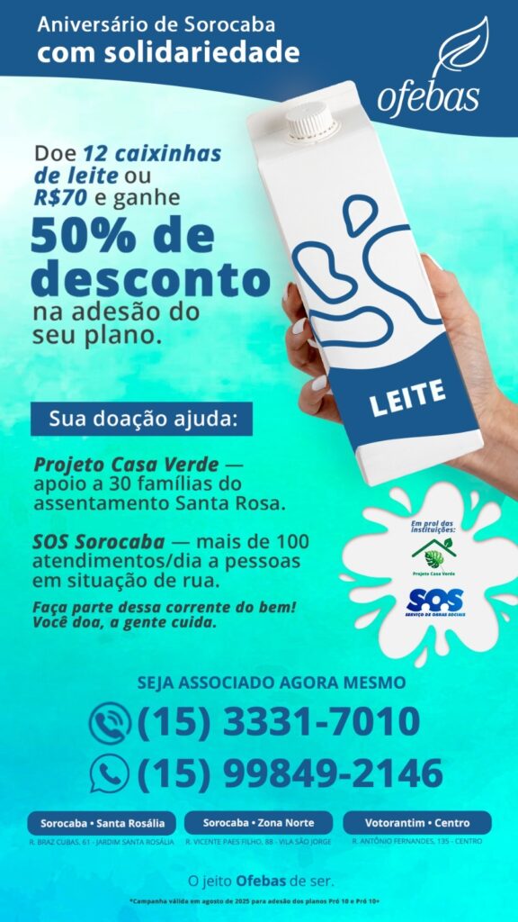 Em comemoração ao aniversário de Sorocaba, a Organização Funerária das Entidades Beneficentes e Assistenciais de Sorocaba (Ofebas) promove, até o dia 31 de agosto, uma campanha solidária para arrecadação de caixas de leite. As doações serão destinadas ao Projeto Casa Verde, que apoia famílias do assentamento Santa Rosa, e ao SOS Sorocaba, que atende pessoas em situação de rua.