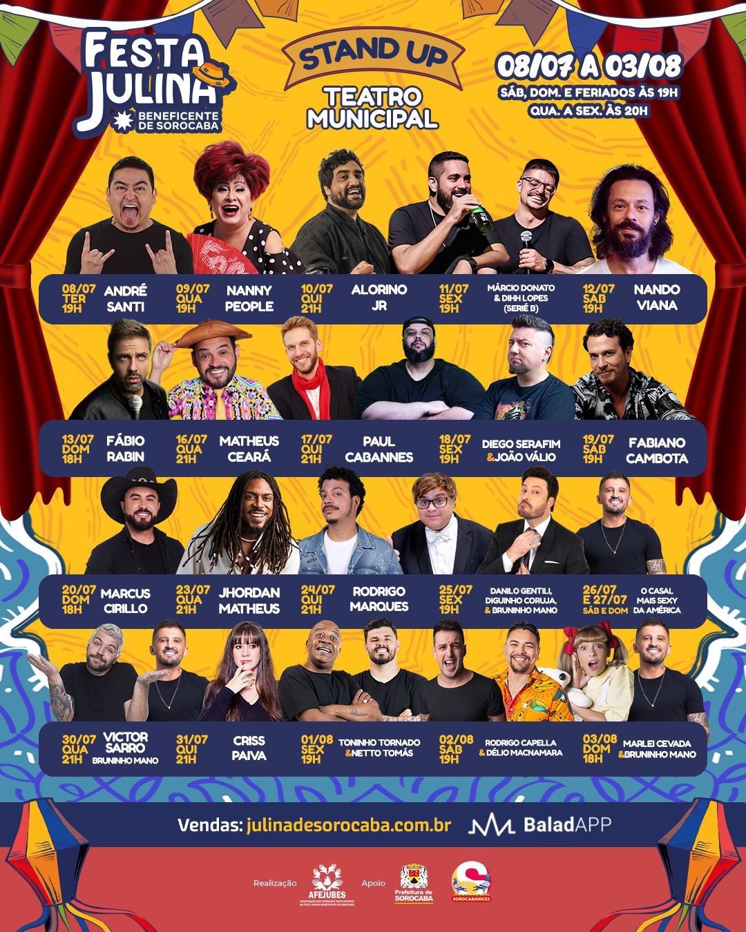A organização da 44ª Festa Julina Beneficente de Sorocaba – Arraiá da Família – divulgou os shows de comédia que serão realizados dentro do evento, no Teatro Municipal Teotônio Vilela, durante a edição deste ano. Entre os destaques estão Nany People, Danilo Gentili, Matheus Ceará, Paul Cabanes e, pela primeira vez, uma peça de teatro: “O Casal Mais Sexy da América”, com a atriz Vera Fischer.
