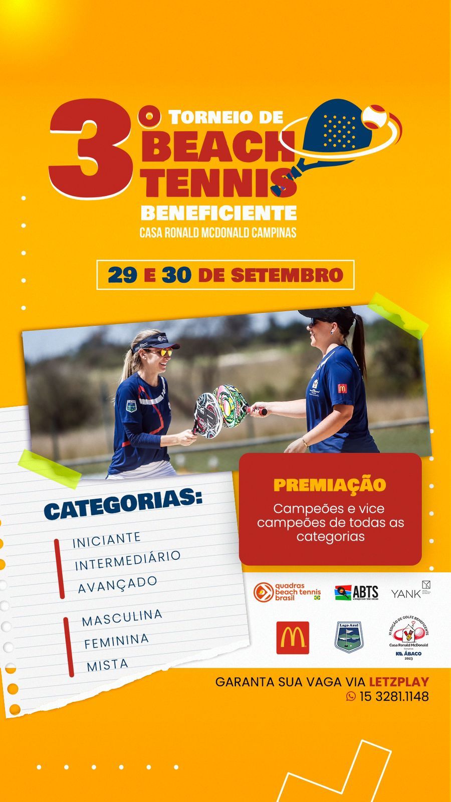 Nos dias 29 e 30 de setembro acontecerá no Lago Azul Golfe Clube, a 3º Edição do Torneio Beneficente de Beach Tennis da Casa Ronald McDonald Campinas.