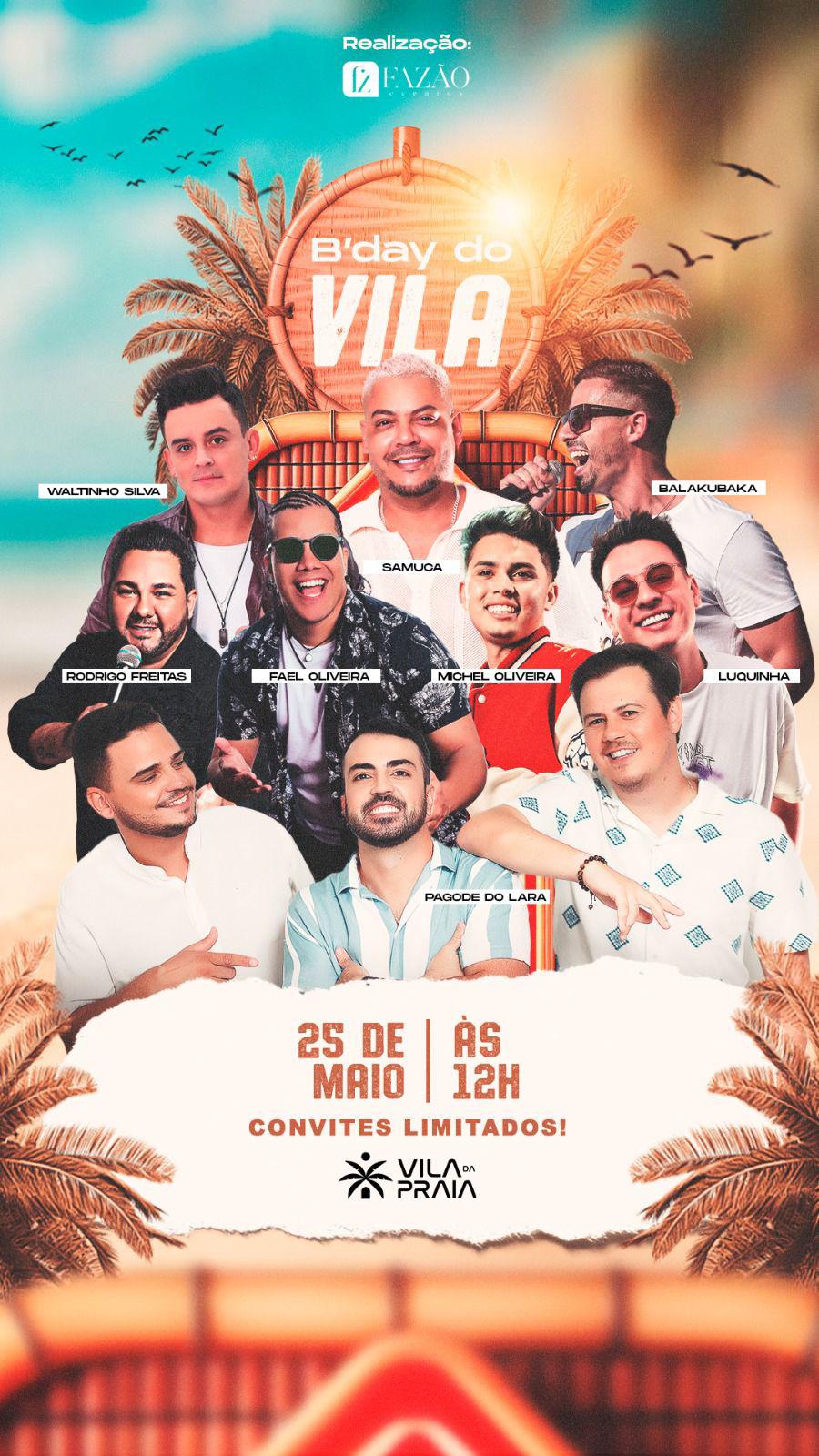 Batizado de “B’Day do Vila”, o evento acontece a partir das 12h, com shows de Samuca, Waltinho Silva, Balakubaka, Rodrigo Freitas, Fael Oliveira, Luquinha, Michel Oliveira e Pagode do Lara.
