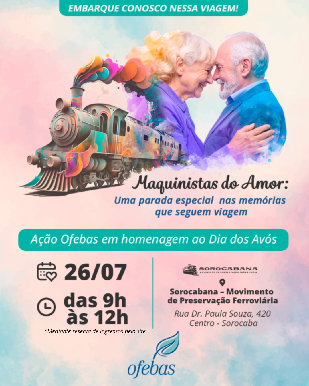 A Ofebas realiza no próximo dia 26 de julho, das 9h às 12h, a ação “Maquinistas do Amor: uma parada especial nas memórias que seguem viagem”, em celebração ao Dia dos Avós. O evento acontece na antiga estação ferroviária de Sorocaba, sede do Movimento de Preservação Ferroviária – Sorocabana, com passeios de trem gratuitos, pipoca, algodão doce, cinema e outras atividades. A iniciativa busca resgatar momentos de reencontros com as raízes afetivas de muitas famílias e prestar homenagem à geração de avós que ajudou a construir a história dos trilhos na cidade.